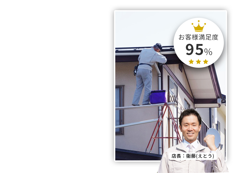 メッセージ:自身も長年戸建てに住んでいるがゆえに様々なお家のお困りごとを体験してきました。その中でも雨樋修理はどこに頼めばいいのか分かりづらいものだと思います。雨樋の耐用年数は材質に寄りますが20年くらいと言われてます。いつの間にか水がポタポタをこぼれているなどの問題が起こっています。そもそも雨樋は水を屋内に侵入させないための設備です。雨樋を壊れたままにしてしまうと雨漏りや木材の腐食が進行してしまいます。当店は雨樋修理のプロ集団です。お客様のお悩みを迅速かつ適切に解決いたします。作業内容と価格に自信があります。誠心誠意修理作業をいたしますので、まずはお気軽にご相談ください。