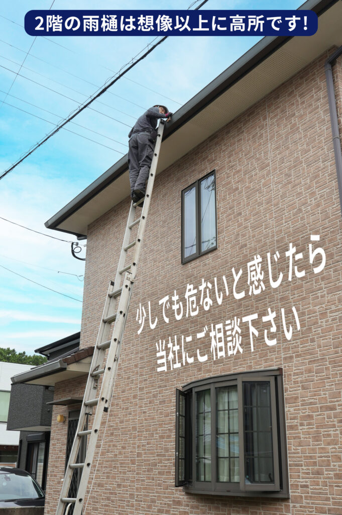 当社は雨樋修理の専門業者として、日々たくさんの現場で作業しており高所作業に精通したプロ集団です。ご自身でやられて、少しでも危ないなと感じた場合、私たちにお任せください