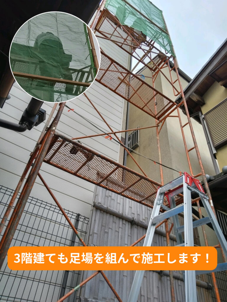 足場代不要とうたう業者さんもいますが、その業者さんは必ずほかの項目の中に足場分の金額を入れてます。当社では足場代はきちんと分け、しっかりと説明したうえで見積書を提示しております。