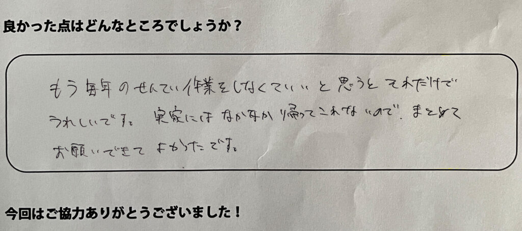 もう毎年の剪定(せんてい)作業をしなくてもいいと思うとそれだけでうれしいです。実家にはなかなか帰ってこれないのでまとめてお願い出来て良かったです。