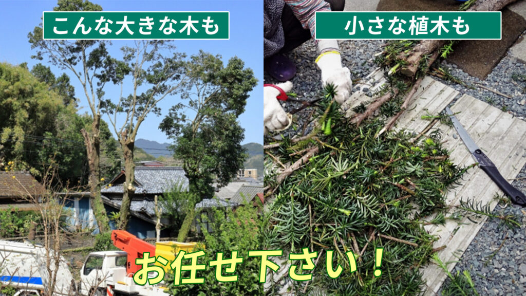 当店が提供している「お家を守る!庭木伐採プラン」はどんな樹種でもどんな大きさでも1本から伐採をする庭木伐採の専門プランです。お家トラブルの原因となる木を伐採することで、事前にトラブルを防ぎます。枝の長さや見た目を整える「剪定(せんてい)」でトラブル対策出来る場合もありますが、「空き家であまり管理できない」「大きくなりすぎている」などの場合は根本から「伐採」するのも一つの解決策です。