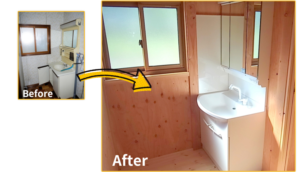 古い洗面台を温かい空間にして頂きありがとうございます。イメージよりとても良い空間となり大満足です