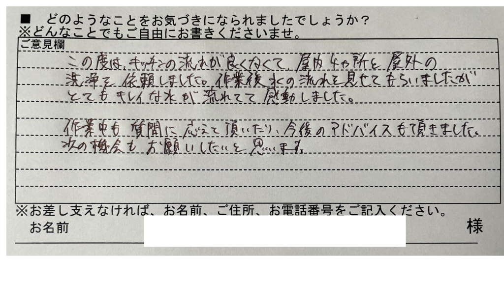 この度はキッチンの流れが良くなくて、屋内4ヵ所と屋外の洗浄を依頼しました。作業後水の流れを見せてもらいましたがとてもキレイな水が流れてて感動しました。作業中も質問に応えて頂いたり今後のアドバイスも頂きました。次の機会もお願いしたいと思います。