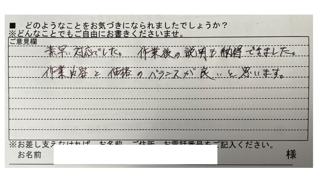 素早い対応でした。作業後の説明も納得できました。作業内容と価格のバランスが良いと思います。
