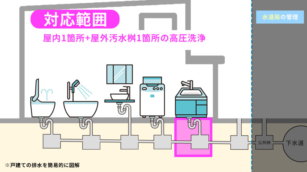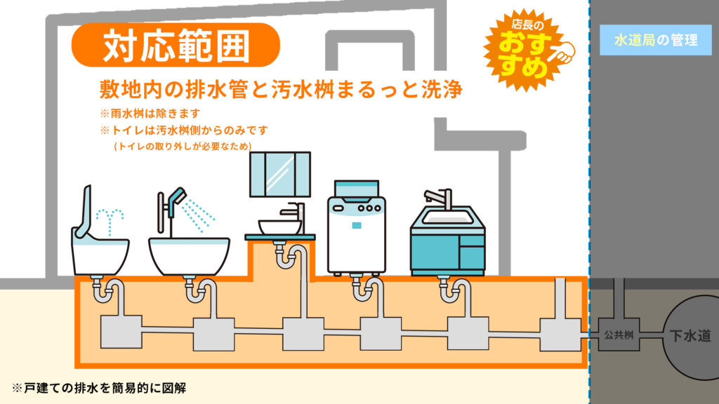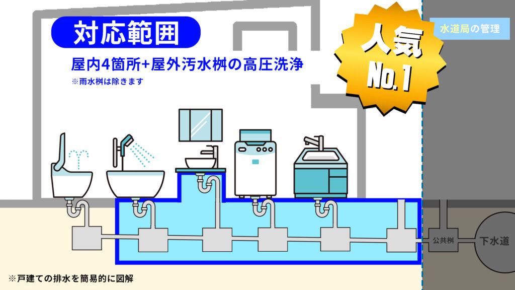トイレは流れる水の勢いが強いため、実は何か異物を落とさない限り詰まりにくい場所です。そのためトイレ以外の水回りの排水管と汚水桝を洗浄するプランです。