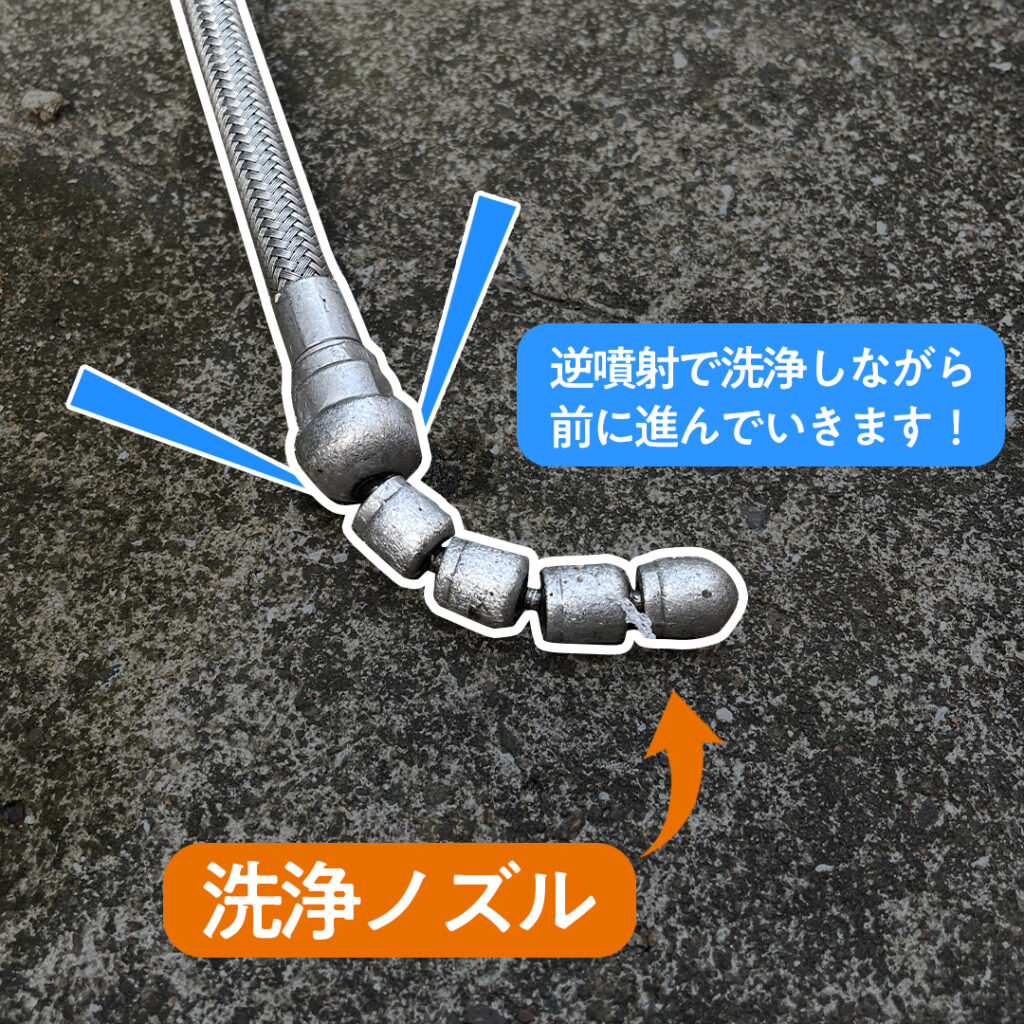 先端には専用の洗浄ノズルがついていて、逆噴射で洗浄しながら排水管内を自走していきます。どぼどぼっと汚れが出てくるのでご見学される施主様は毎回「わーっ!!」と、歓声に近い声を上げて頂いてます。