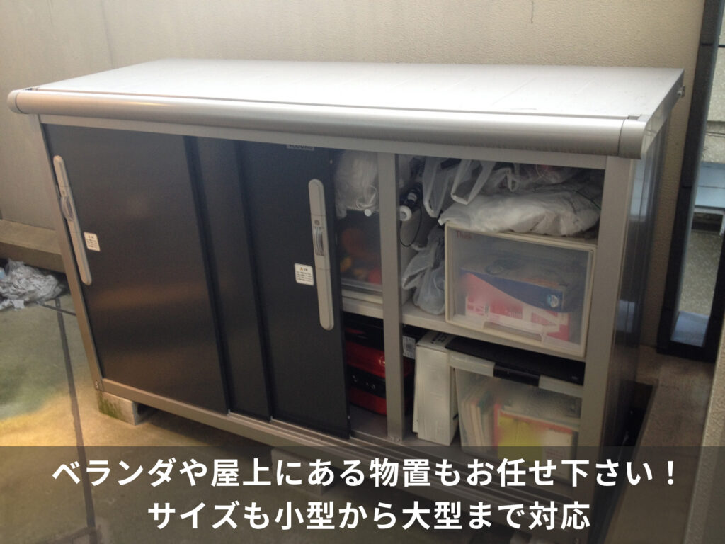 当社が提供している「超スッキリ!物置撤去プラン」はお庭、ベランダ、屋上など設置されている箇所や材質(スチール製、木製、DIYなど)を問わずどのような物置でも安全に回収し処分いたします。
