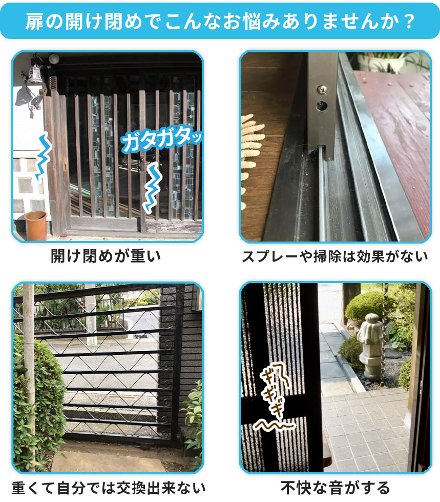 プロならではの的確な施工で、重い・引っかかる・外れそう・ガタつき・異音といった不安を防ぎながら、開閉のスムーズさと寿命も大きくのばせます。