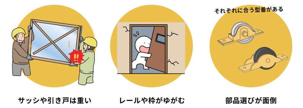 また、サッシや引き戸・門扉は想像以上に重く、外したり持ち上げたりする作業中に指を挟む・落としてケガをするリスクがあります。無理に動かすとレールを削ったり、枠を歪ませて症状が悪化することも。戸車は種類・サイズが多く、「買ったけど合わない」「左右や形状が違う」など部品選びで二度手間になるケースも少なくありません。