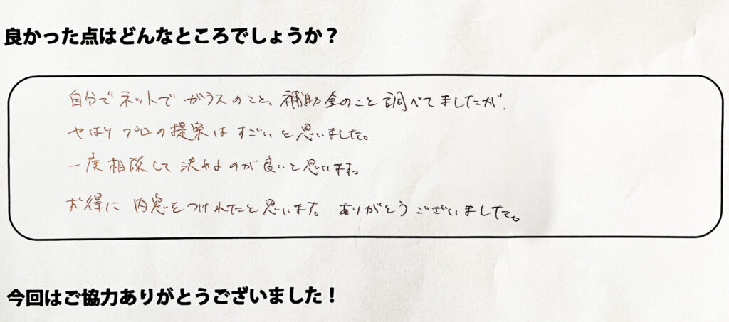 自分でネットでガラスのこと、補助金のこと調べてましたがやはりプロの提案はすごいと思いました。一度相談して決めるのがいいと思います。お得に内窓をつけれたと思いました。ありがとうございました。