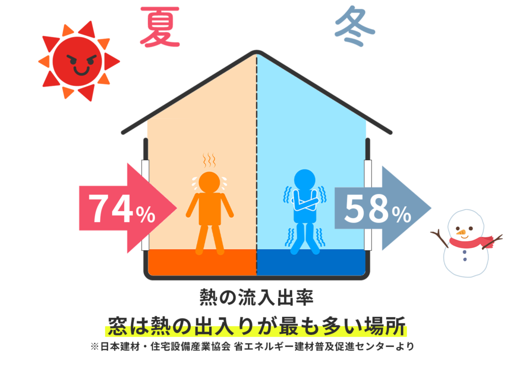 夏は窓から熱が入り室内が熱くなり、冬は窓から熱が逃げ室内が寒くなります。熱は「暖かい場所から冷たい場所に移動する性質」があるためこのような現象が起きます。そして熱の出入り口のほとんどは「窓」なため窓の断熱は大切と言えます。