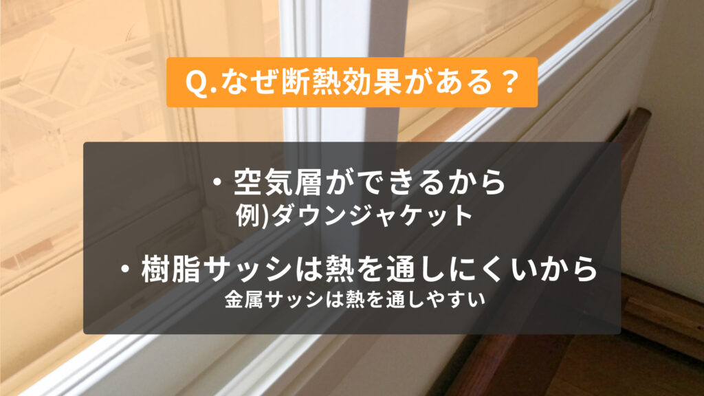 内窓リフォームは既存の窓と新たに室内側に窓を取り付けることでその間に空気層を作ります。ダウンジャケットと同じ原理で空気層があると熱の移動を抑えることが出来ます。また、室内側につける窓のサッシを樹脂にすることで熱を通しにくくしています。