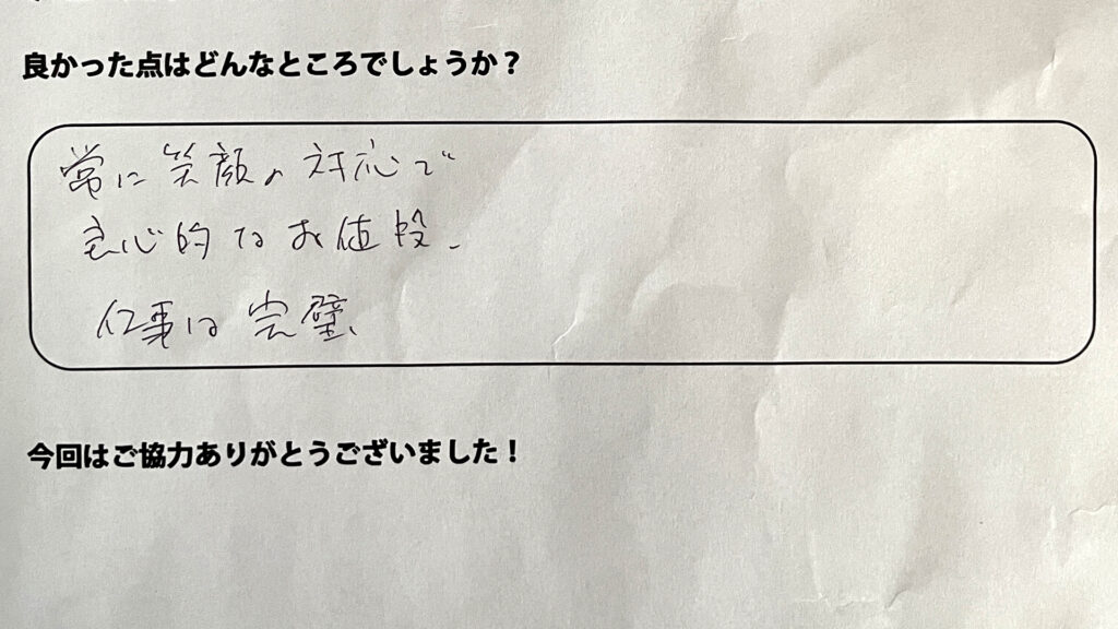 常に笑顔の対応で良心的なお値段。仕事は完璧。